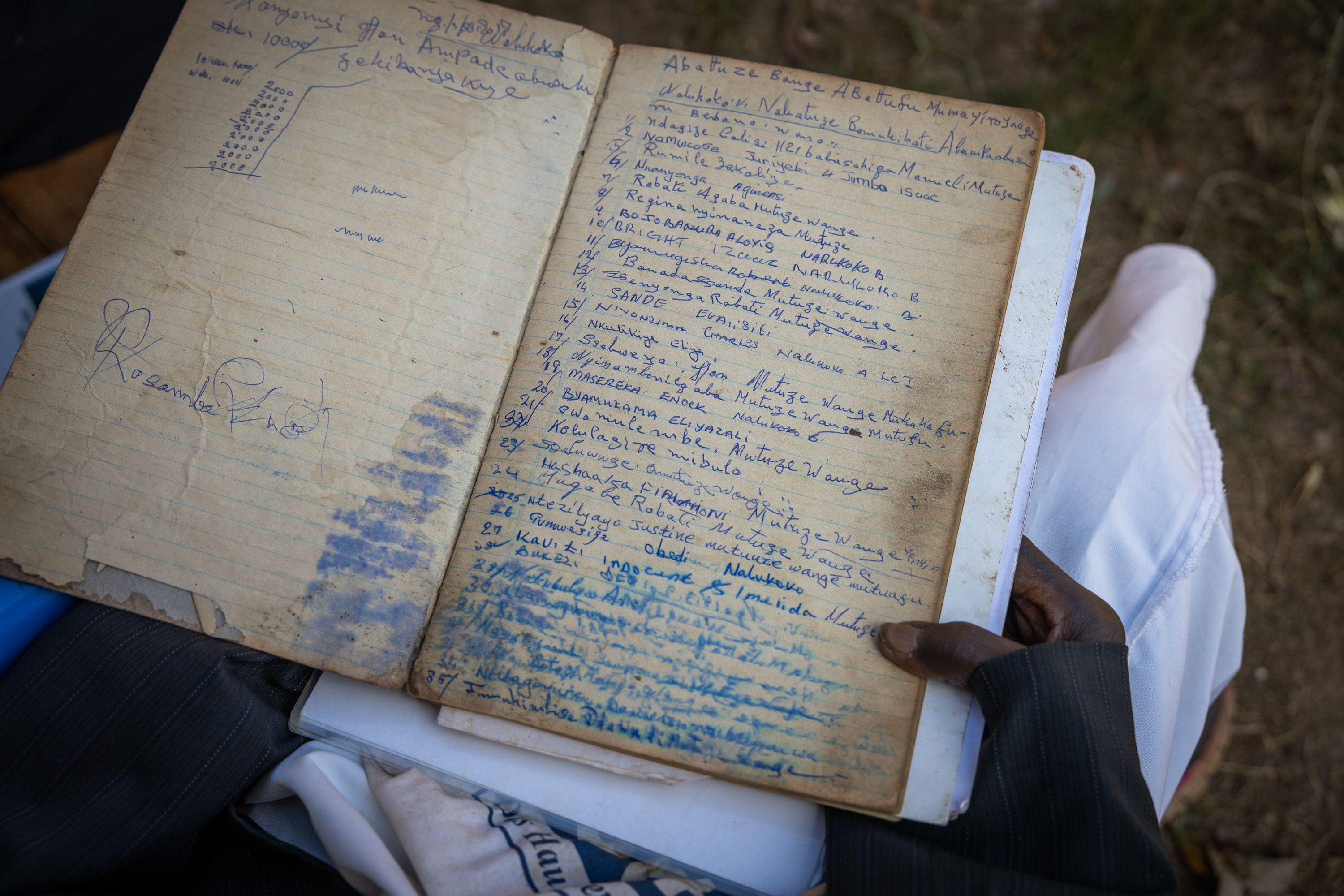 Aufgrund des komplexen Mailo-Land Systems und den doppelten Rechten von Verpächter*innen und Pächter*innen leben Erstere oft in tiefster Armut. Die Rechte von Pächter*innen auf ihr Kibanja machen es schwer für Verpächter*innen, Einkommen aus Investitionen in ihr eigenes Land zu generieren. In einem Zipfel des Dorfes Nalukoko bewegt sich Paul Kassamba (85) auf einen Stock gestützt langsam aus seinem Lehmhaus. Ein bunter Strohhut beschirmt sein Gesicht, das von den Jahren sichtlich gezeichnet ist. Er schlägt ein altes Notizbuch auf und kneift die Augen zusammen, um die lange Liste mit Namen zu entziffern.