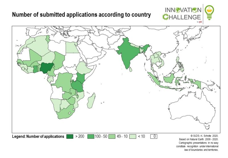 The origin of the participants reflects the wide range of GIZ partner countries in Asia and Africa as 74 contributions come from South and Southeast Asian countries and 37 from North Africa. However, with the submission of 936 innovative ideas, applications from sub-Saharan Africa clearly dominated. In total, applications were received from 44 countries.