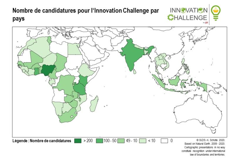 L'origine des participants témoigne du large éventail de pays partenaires de la GIZ en Asie et en Afrique : 74 contributions proviennent de pays d'Asie du Sud et du Sud-Est et 37 d'Afrique du Nord. Cependant, les candidatures provenant d'Afrique subsaharienne ont dominé avec 936 idées soumises. Au total, nous avons reçu des candidatures de 44 pays.